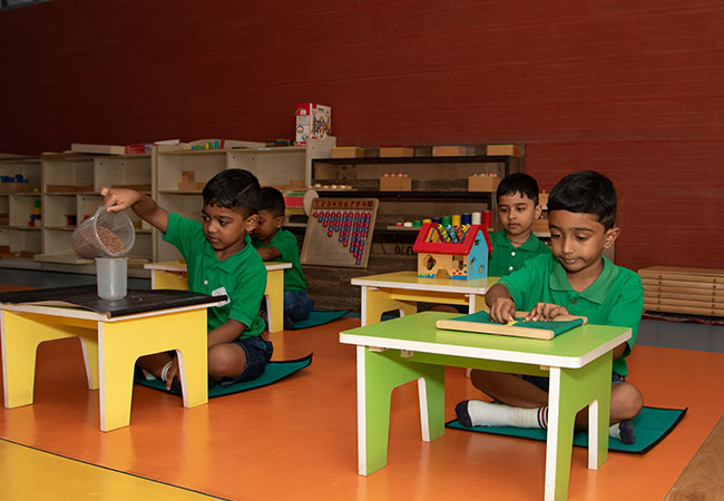 Carefully arranged shelves and authentic Montessori materials create an environment where children learn through independent exploration. They choose their own activities—pouring, threading, sorting, building, and matching—each designed to develop coordination, orderliness, and discipline. Teachers observe quietly, stepping in only when needed, encouraging children to think, try, repeat, and succeed on their own. This room builds important life skills such as independence, problem-solving, patience, and focus, preparing children for higher levels of learning.