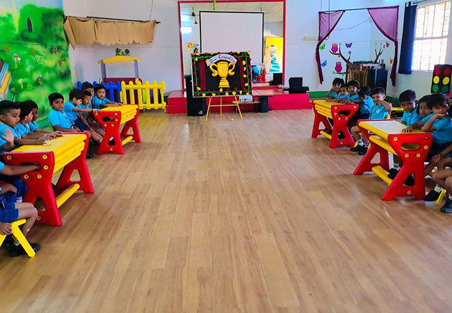 A cheerful open space where children gather each morning to begin their day with positivity. They participate in songs, stretches, stories, birthday celebrations, and important announcements. The assembly helps children become confident speakers, good listeners, and active participants in the school community. It builds a sense of routine, belonging, and togetherness, setting a happy tone for the rest of the day.